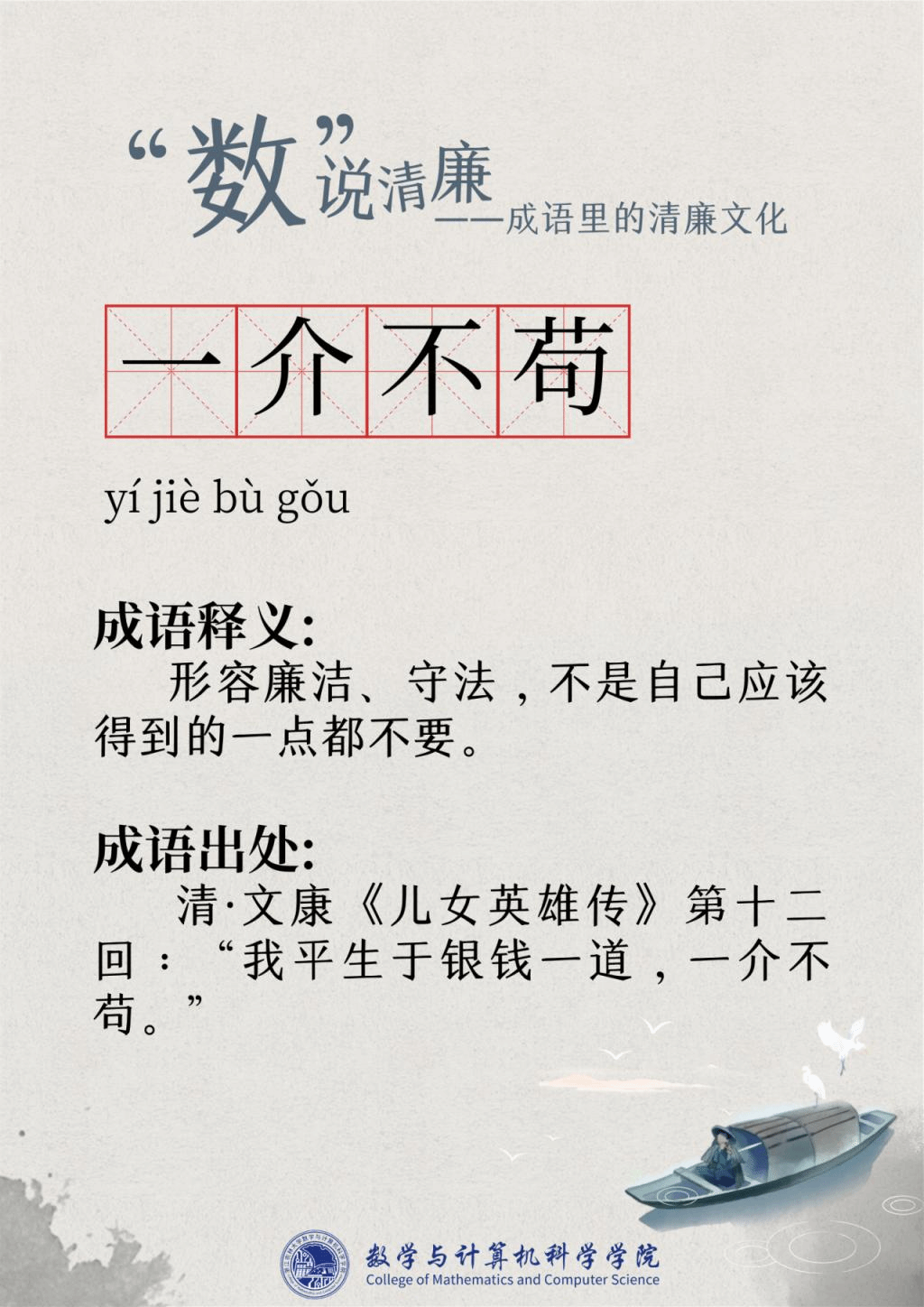“廉洁”一词最早出现在屈原的作品“宁廉洁正直以自清”中。为人清廉正直从古至今都被视作立身处世最重要的品质之一。习近平总书记曾强调要“加强新时代廉洁文化建设涵养求真务实,团结奋斗的时代新风”。为深入挖掘中华传统文化中数字与成语诗词结合的廉洁要素,展现“廉洁”在中国传统文化瑰宝中浓墨重彩的独特地位,充分发挥清廉文化浸润校园、春风化雨的积极作用,9428cn太阳集团古天乐现推出“数”说清廉——成语里的清廉文化系列文章,以传统文化之土壤培育清廉之花。