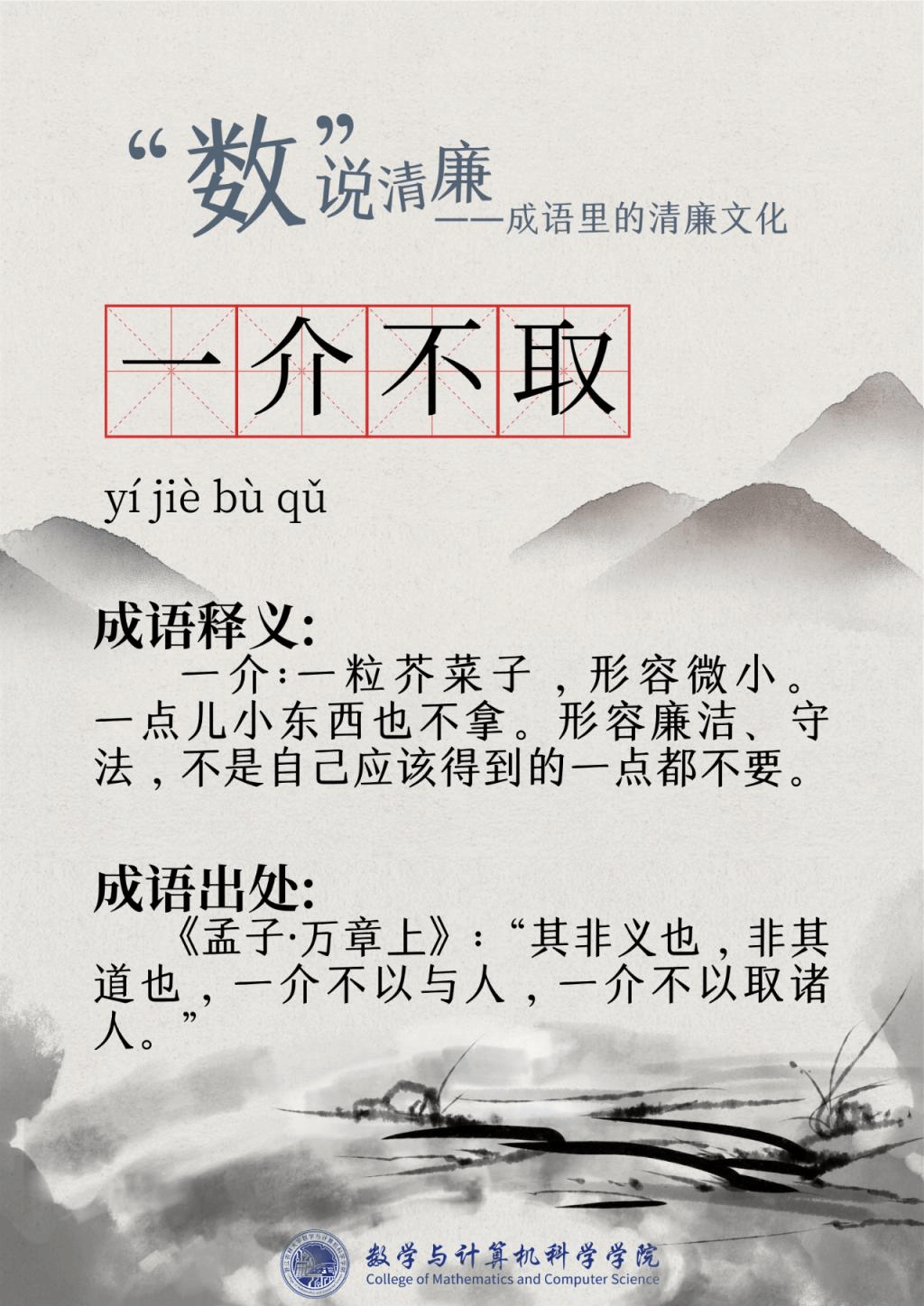 “廉洁”一词最早出现在屈原的作品“宁廉洁正直以自清”中。为人清廉正直从古至今都被视作立身处世最重要的品质之一。习近平总书记曾强调要“加强新时代廉洁文化建设涵养求真务实,团结奋斗的时代新风”。为深入挖掘中华传统文化中数字与成语诗词结合的廉洁要素,展现“廉洁”在中国传统文化瑰宝中浓墨重彩的独特地位,充分发挥清廉文化浸润校园、春风化雨的积极作用,9428cn太阳集团古天乐现推出“数”说清廉——成语里的清廉文化系列文章,以传统文化之土壤培育清廉之花。