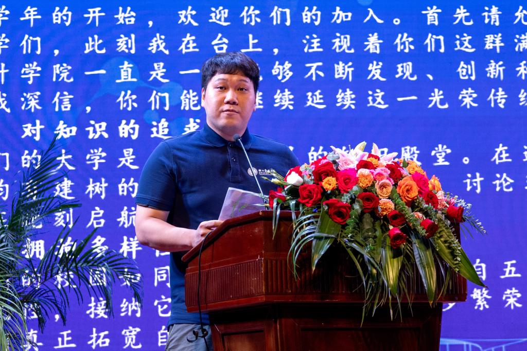 计算机科学与技术专业专任教师陈哲艺作为教师代表用全英文演讲的方式,鼓励同学们要满怀对知识的追求,理解和尊重不同的观点,不断磨练自己的毅力,多多结交良师益友,在知识的碰撞中茁壮成长,成为能够堪当民族复兴大任的有用之才。在校生代表应统202班的陆晨三同学、本科生新生代表计算机234班沈梦瑶同学、研究生新生代表数计研232班袁俊超同学先后发言。