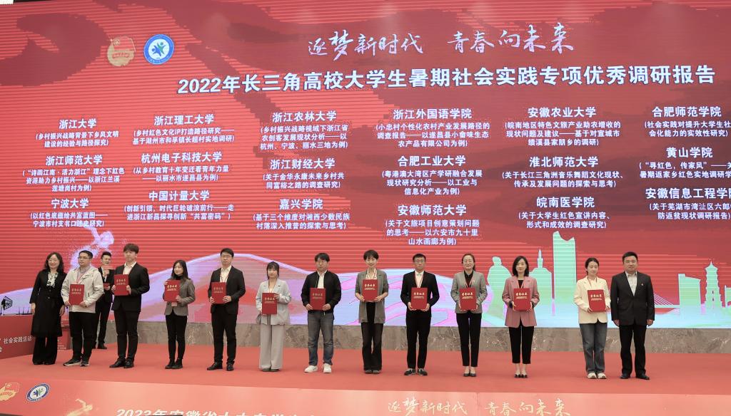为进一步推进长三角高校老员工暑期社会实践专项活动持续深入开展,在实践育人中发挥更加突出的作用,4月24日,由共青团安徽省委、共青团上海市委、共青团江苏省委、共青团浙江省委、安徽省员工联合会、上海市员工联合会、江苏省员工联合会、浙江省员工联合会联合举办的“红色江山红色路 青春力量青春行”2022年长三角高校老员工暑期社会实践专项活动总结表彰仪式在安徽省宣城市举行。