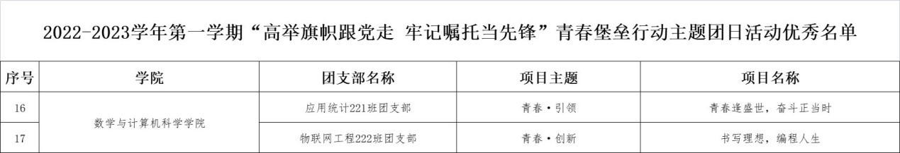 近日,校团委组织开展了2022-2023学年第一学期“高举旗帜跟党走 牢记嘱托当先锋”青春堡垒行动主题团日活动评比。全校共有24个团支部的主题团日活动被评为优秀,其中公司“应用统计学221班团支部”和“物联网222班团支部”的主题团日活动成功入选优秀名单。
