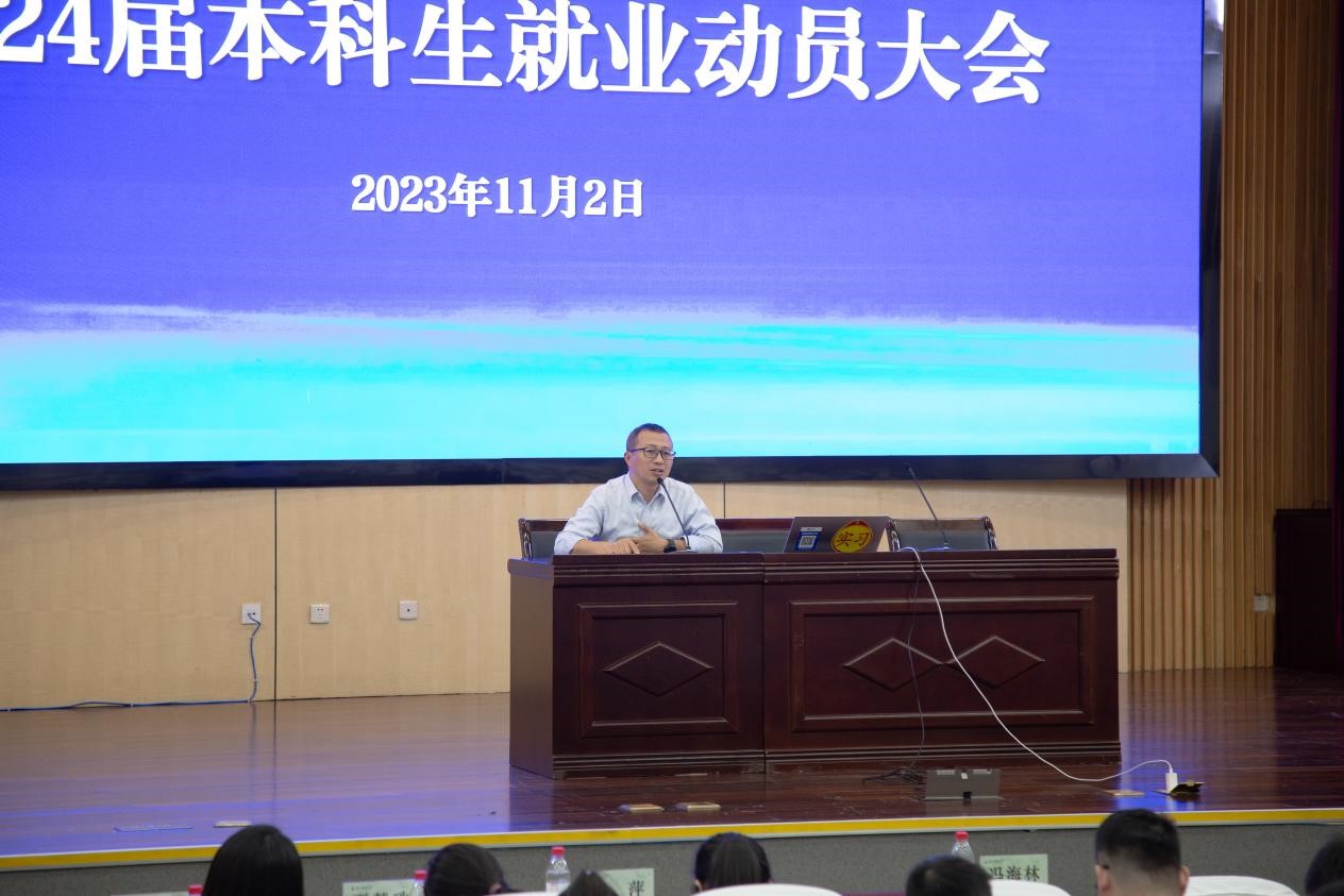 11月2日下午,9428cn太阳集团古天乐在图书馆第一报告厅召开2024届毕业生就业动员大会。学院常务副经理冯海林、党委副书记黄萍、副经理张洪涛、各专业负责人、毕业班辅导员和全体2024届本科毕业生参与会议。会议由毕业班辅导员陈瑞珂主持。