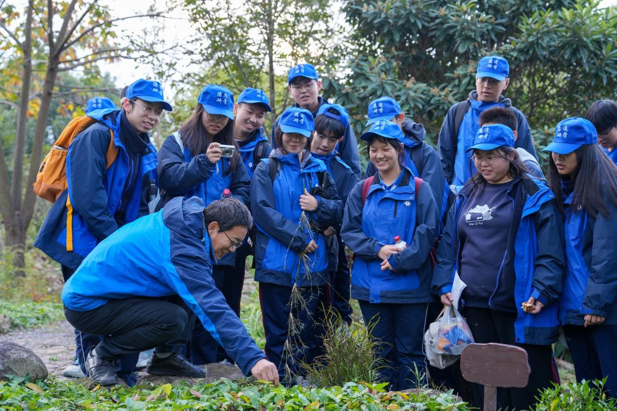 来自中药学专业的徐建伟老师是百草园的主要建设者,他对园内的所有植物都如数家珍。徐老师带领员工志愿者们为师生仔细地讲解了百草园里的每一株中草药的药性和功效,也耐心解答了同学们提出的各类问题。同学们纷纷感叹“老师和学长学姐们真厉害,认得那么多中草药”。