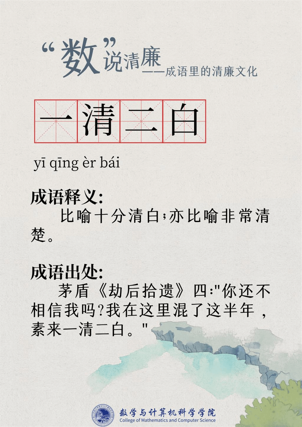 “廉洁”一词最早出现在屈原的作品“宁廉洁正直以自清”中。为人清廉正直从古至今都被视作立身处世最重要的品质之一。习近平总书记曾强调要“加强新时代廉洁文化建设涵养求真务实,团结奋斗的时代新风”。为深入挖掘中华传统文化中数字与成语诗词结合的廉洁要素,展现“廉洁”在中国传统文化瑰宝中浓墨重彩的独特地位,充分发挥清廉文化浸润校园、春风化雨的积极作用,9428cn太阳集团古天乐现推出“数”说清廉——成语里的清廉文化系列文章,以传统文化之土壤培育清廉之花。