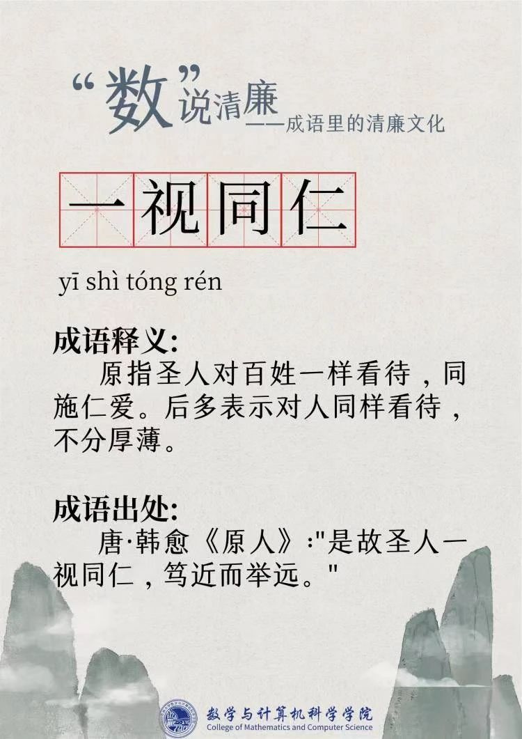 “廉洁”一词最早出现在屈原的作品“宁廉洁正直以自清”中。为人清廉正直从古至今都被视作立身处世最重要的品质之一。习近平总书记曾强调要“加强新时代廉洁文化建设涵养求真务实,团结奋斗的时代新风”。为深入挖掘中华传统文化中数字与成语诗词结合的廉洁要素,展现“廉洁”在中国传统文化瑰宝中浓墨重彩的独特地位,充分发挥清廉文化浸润校园、春风化雨的积极作用,9428cn太阳集团古天乐现推出“数”说清廉——成语里的清廉文化系列文章,以传统文化之土壤培育清廉之花。