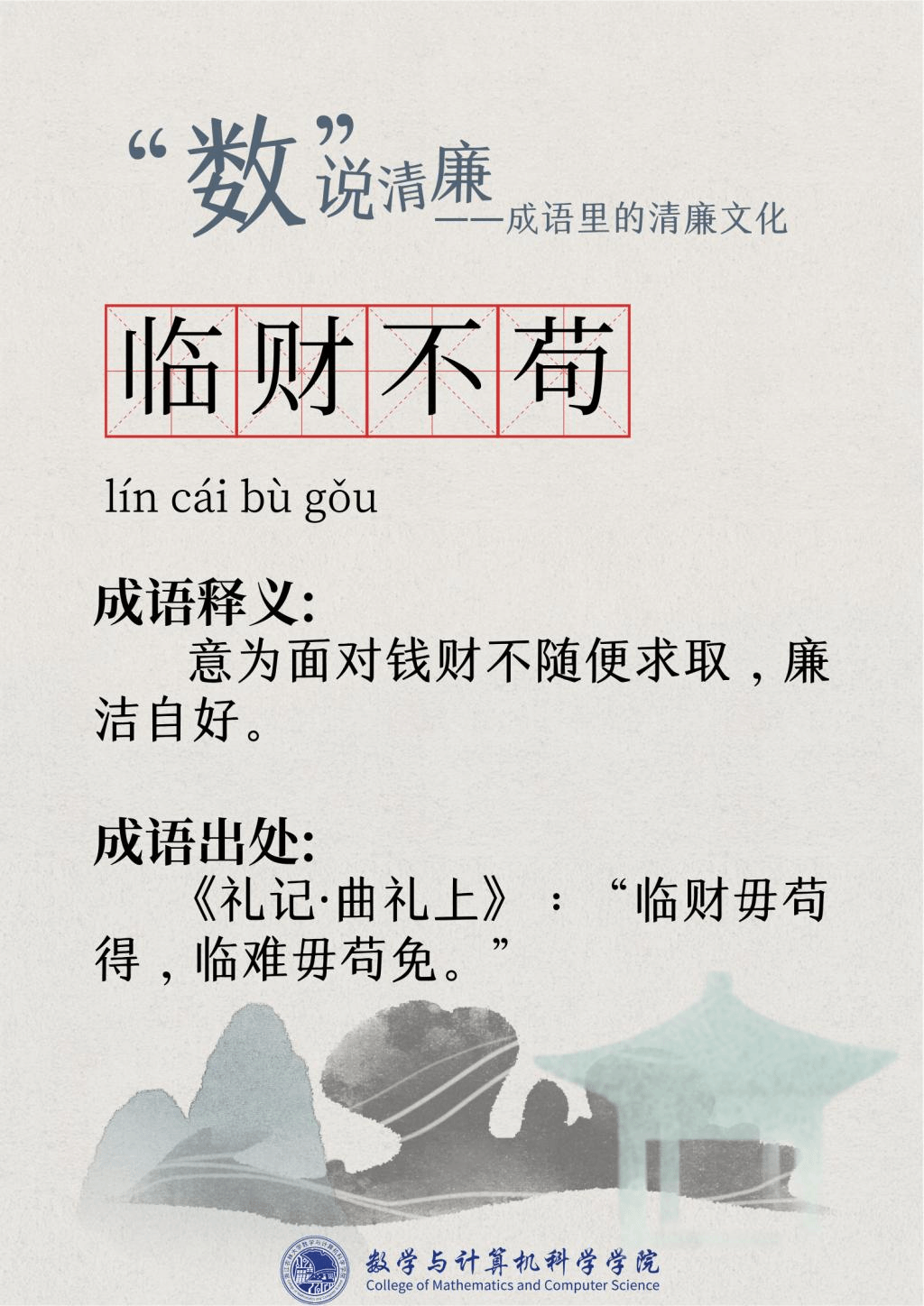 “廉洁”一词最早出现在屈原的作品“宁廉洁正直以自清”中。为人清廉正直从古至今都被视作立身处世最重要的品质之一。习近平总书记曾强调要“加强新时代廉洁文化建设涵养求真务实,团结奋斗的时代新风”。为深入挖掘中华传统文化中数字与成语诗词结合的廉洁要素,展现“廉洁”在中国传统文化瑰宝中浓墨重彩的独特地位,充分发挥清廉文化浸润校园、春风化雨的积极作用,9428cn太阳集团古天乐现推出“数”说清廉——成语里的清廉文化系列文章,以传统文化之土壤培育清廉之花。