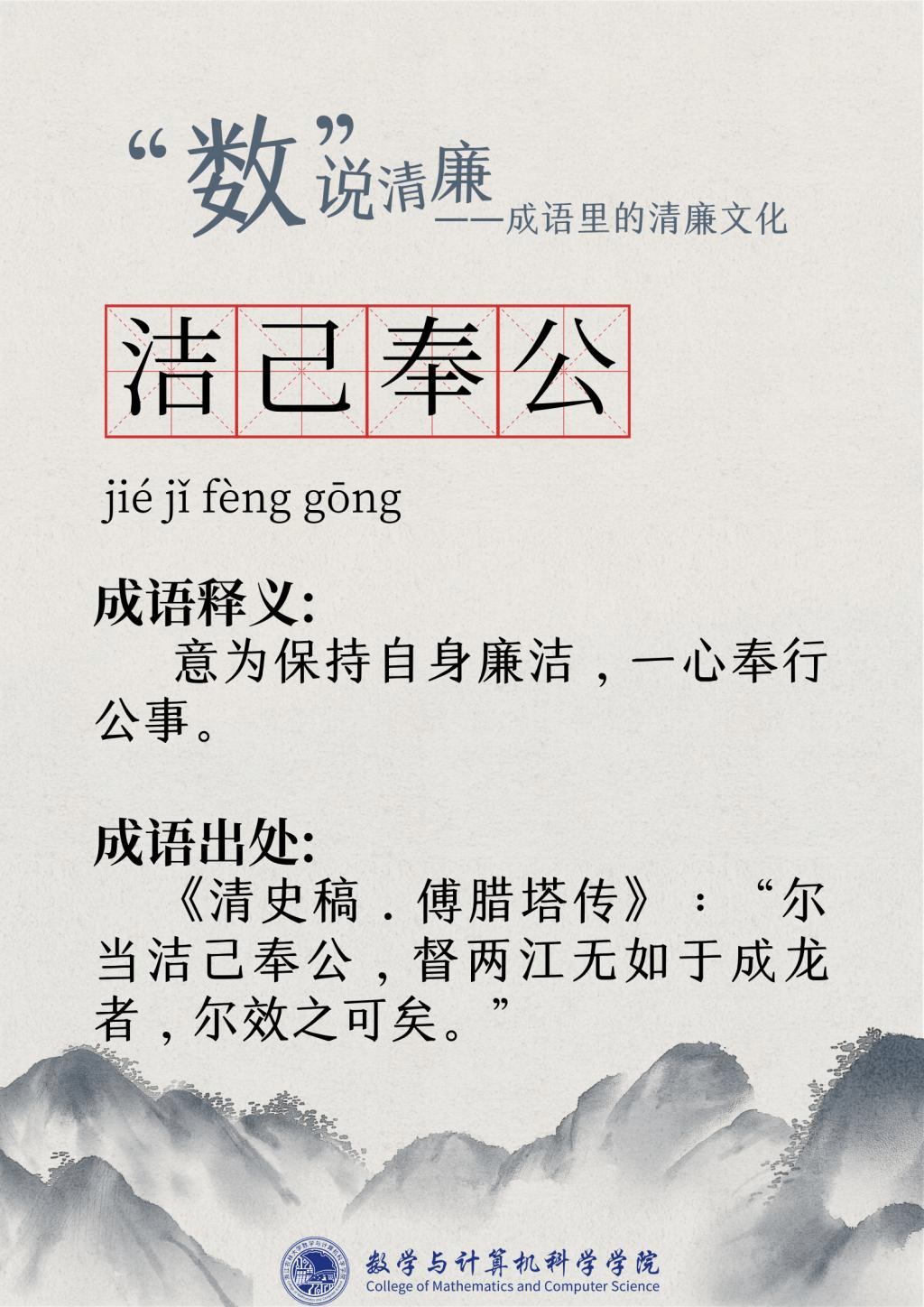 “廉洁”一词最早出现在屈原的作品“宁廉洁正直以自清”中。为人清廉正直从古至今都被视作立身处世最重要的品质之一。习近平总书记曾强调要“加强新时代廉洁文化建设涵养求真务实,团结奋斗的时代新风”。为深入挖掘中华传统文化中数字与成语诗词结合的廉洁要素,展现“廉洁”在中国传统文化瑰宝中浓墨重彩的独特地位,充分发挥清廉文化浸润校园、春风化雨的积极作用,9428cn太阳集团古天乐现推出“数”说清廉——成语里的清廉文化系列文章,以传统文化之土壤培育清廉之花。