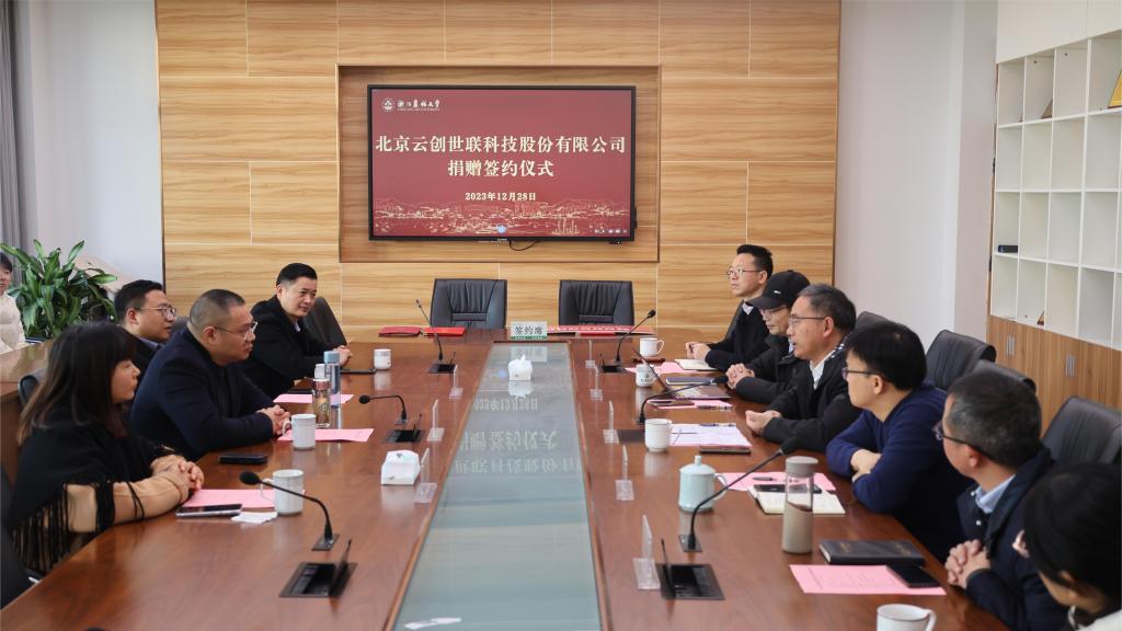 12月28日,北京云创世联科技股份有限公司捐赠签约仪式在学11-304举行。北京云创世联科技股份有限公司总经理姚欣荣一行,学校副董事长、基金会副理事长胡祖吉,公司党政领导班子出席仪式,仪式由党委书记冯金明主持。