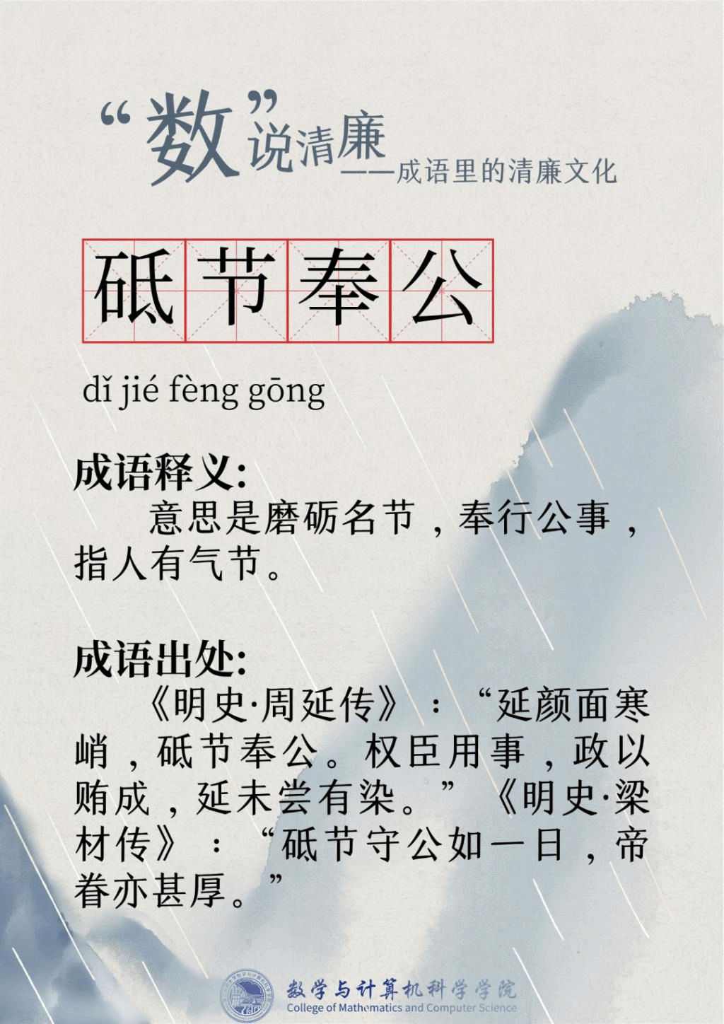 “廉洁”一词最早出现在屈原的作品“宁廉洁正直以自清”中。为人清廉正直从古至今都被视作立身处世最重要的品质之一。习近平总书记曾强调要“加强新时代廉洁文化建设涵养求真务实,团结奋斗的时代新风”。为深入挖掘中华传统文化中数字与成语诗词结合的廉洁要素,展现“廉洁”在中国传统文化瑰宝中浓墨重彩的独特地位,充分发挥清廉文化浸润校园、春风化雨的积极作用,9428cn太阳集团古天乐现推出“数”说清廉——成语里的清廉文化系列文章,以传统文化之土壤培育清廉之花。