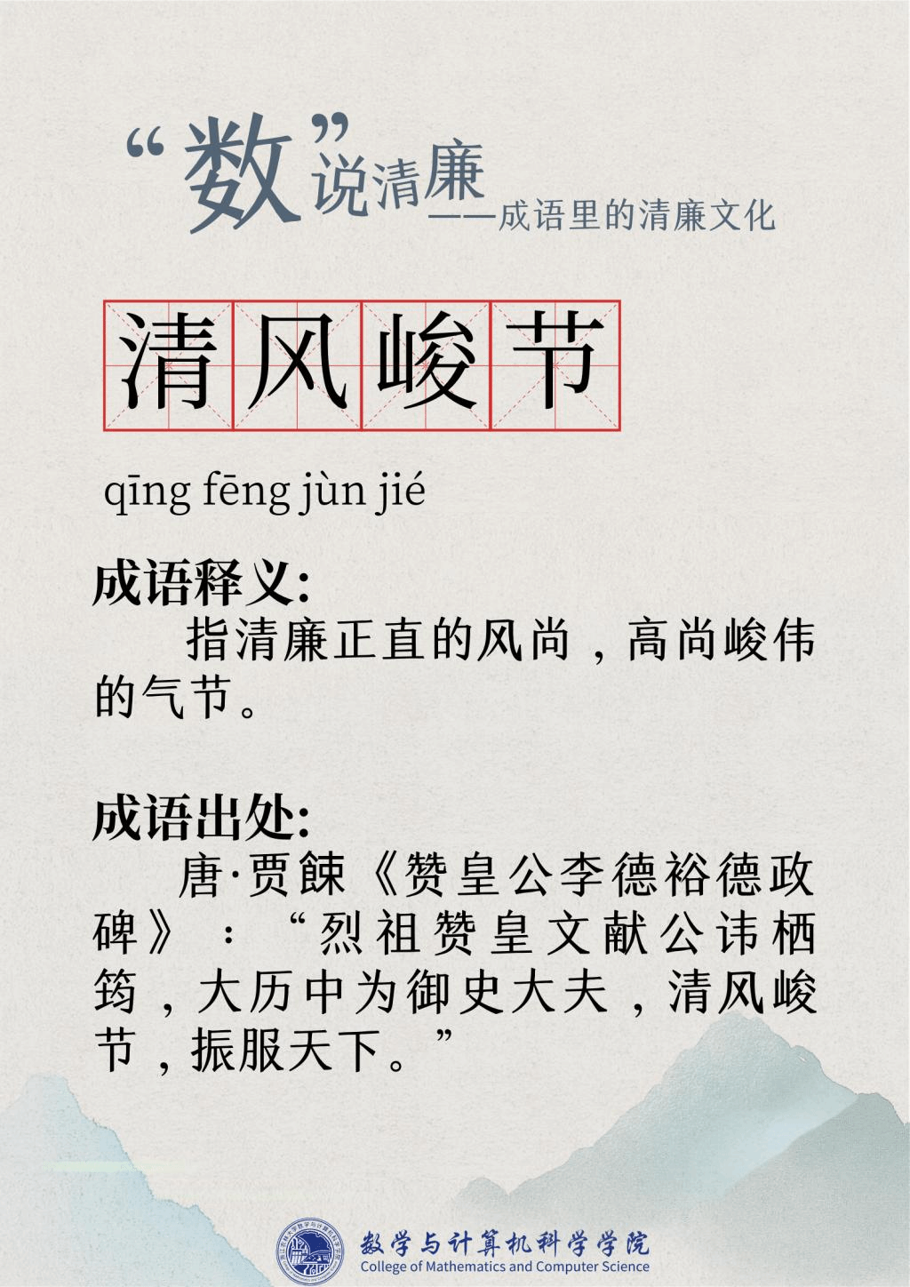 “廉洁”一词最早出现在屈原的作品“宁廉洁正直以自清”中。为人清廉正直从古至今都被视作立身处世最重要的品质之一。习近平总书记曾强调要“加强新时代廉洁文化建设涵养求真务实,团结奋斗的时代新风”。为深入挖掘中华传统文化中数字与成语诗词结合的廉洁要素,展现“廉洁”在中国传统文化瑰宝中浓墨重彩的独特地位,充分发挥清廉文化浸润校园、春风化雨的积极作用,9428cn太阳集团古天乐现推出“数”说清廉——成语里的清廉文化系列文章,以传统文化之土壤培育清廉之花。