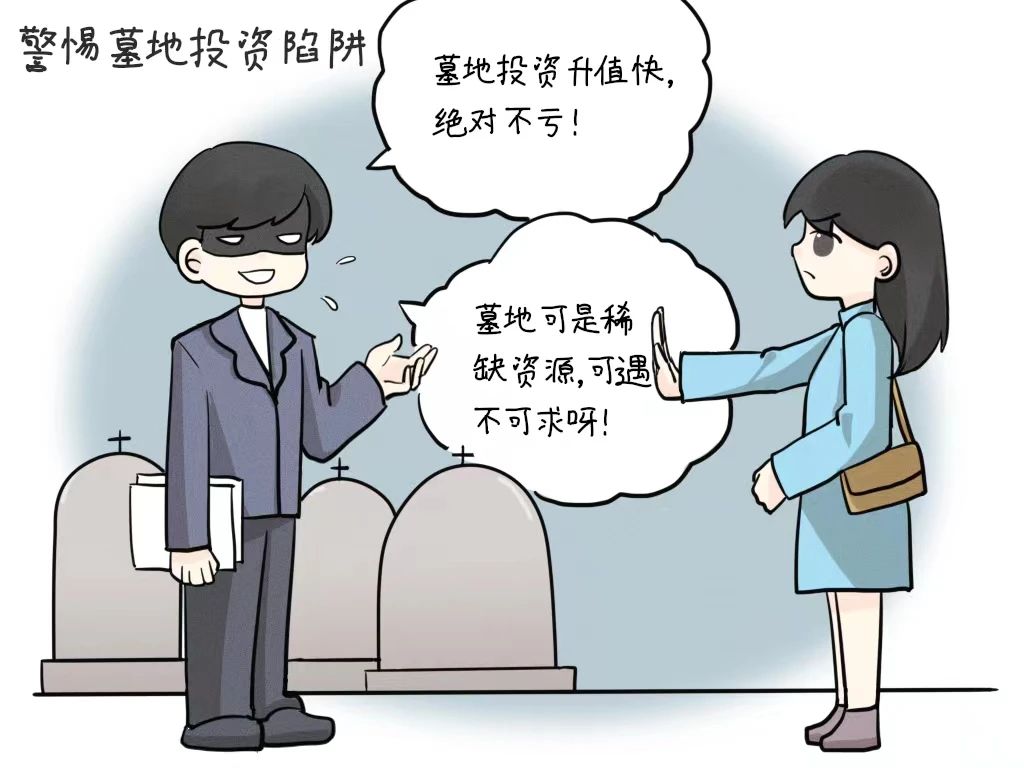 诈骗分子可能会以“墓地投资升值快”、“稀缺资源”等理由诱骗消费者投资购买墓地,务必谨慎对待,避免上当受骗。
