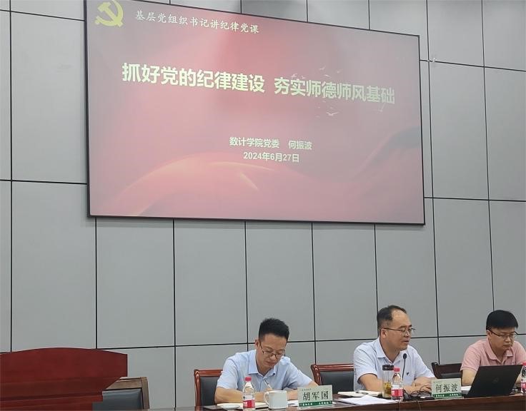 何振波以“抓好党的纪律建设、夯实师德师风基础”为题讲授纪律党课。他要求,大家要深刻认识从严抓好党的纪律建设,夯实师德师风基础,持续护航学院健康持续发展的重要性;要严格遵守《新时代高校教师职业行为十项准则》,以警示教育通报案例为戒,在日常工作中扎紧学院师德师风制度篱笆;要持续推进基层党建和事业融合发展,加强基层治理,涵养风清气正的学院政治生态。结合暑期工作,他对安全稳定、人才招聘、教职工疗休养等工作进行了部署说明。
