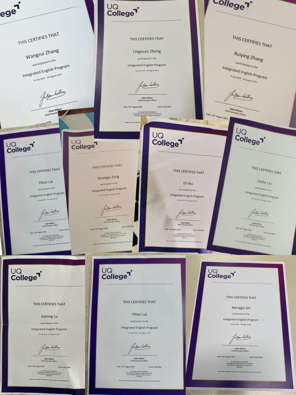 为期35天的时间里,17名数计学子深入昆士兰大学学习交流,不仅在英语语言技能上取得了显著提升,更在跨文化交流中拓宽了国际视野。同学们通过语言班的学习,与不同国籍的同学交流,接触新颖的教学理念和学术观点,拥抱多元文化互动,切身感受海外学习的特色。在最后的语言考试中,所有同学顺利通过,并取得结业证书。