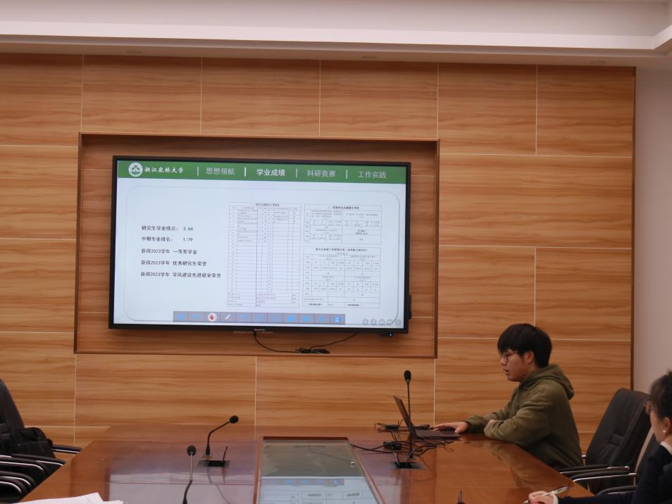 员工办负责人介绍了2024年国家奖学金评审的相关政策。四名研究生以PPT演讲答辩的方式从思想道德、学业成绩、学科竞赛、科研创新、综合拓展素质等多方面进行了风采展示。整体汇报展现了各候选人在校期间取得的优异成绩以及良好的语言表达能力和逻辑思维能力,获得了评审老师的一致好评。