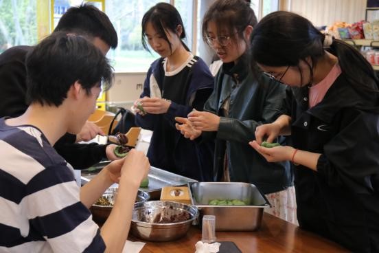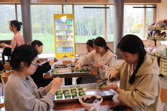 依照详细的指引和指导,同学们很快上手。青汁与糯米粉揉和而成的面团包裹住清甜的豆沙或鲜咸的嫩笋,经过同学们的双手揉搓,一个个色如碧玉、糯韧绵软、清香扑鼻的青团很快做好了。同学们纷纷与自己亲手做的青团拍照留念,并彼此分享制作心得,每个人的脸上都洋溢着幸福的微笑。趁着厨房蒸青团的功夫,同学们结伴到餐厅外与鲜嫩的春色合影。青团蒸熟,香气弥漫在空气中,仿佛将春天的味道都凝聚在了这小小的吃食之中,一口咬下去,软糯可口、令人回味。